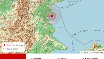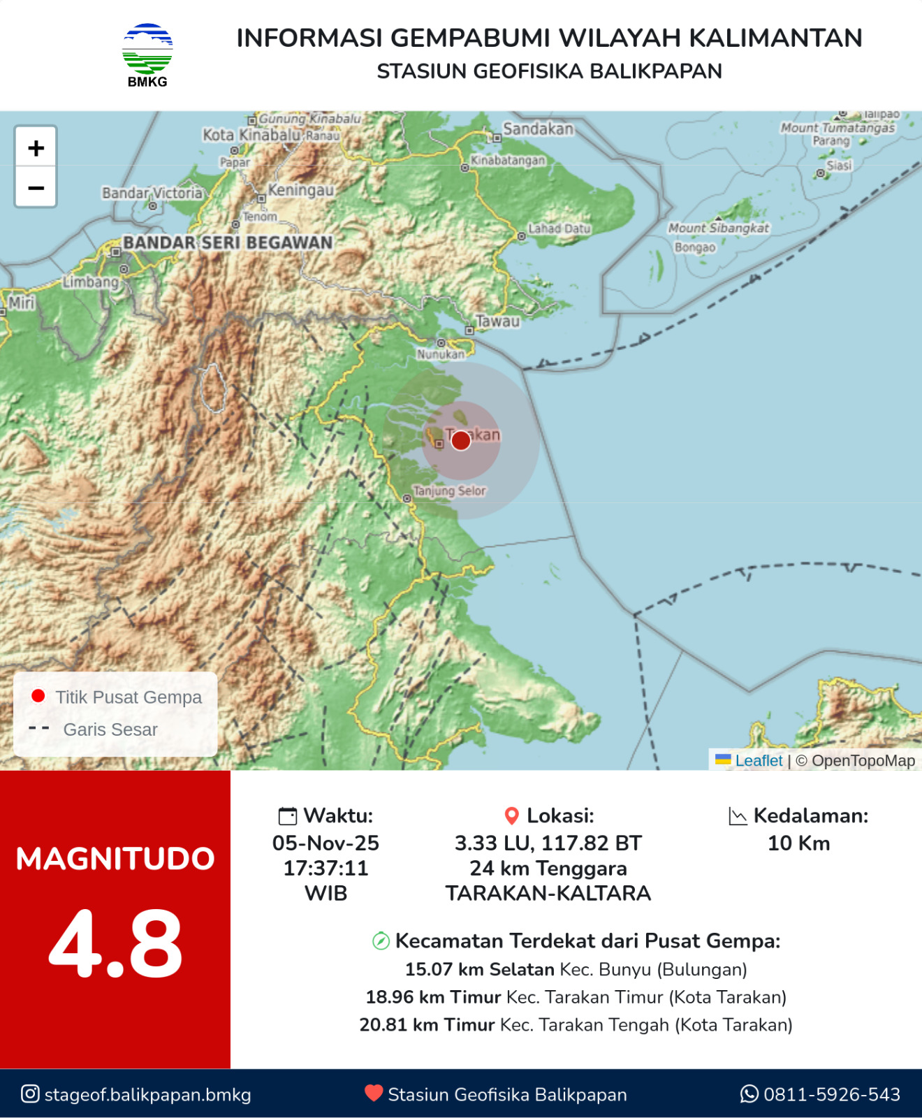 NEWSNUSANTARA, TANJUNG REDEB – Guncangan gempa bumi berkekuatan magnitudo 4,8 yang terjadi di wilayah Tarakan, Kalimantan Utara, pada Selasa (5/11) sore, turut dirasakan warga di Kabupaten Berau.