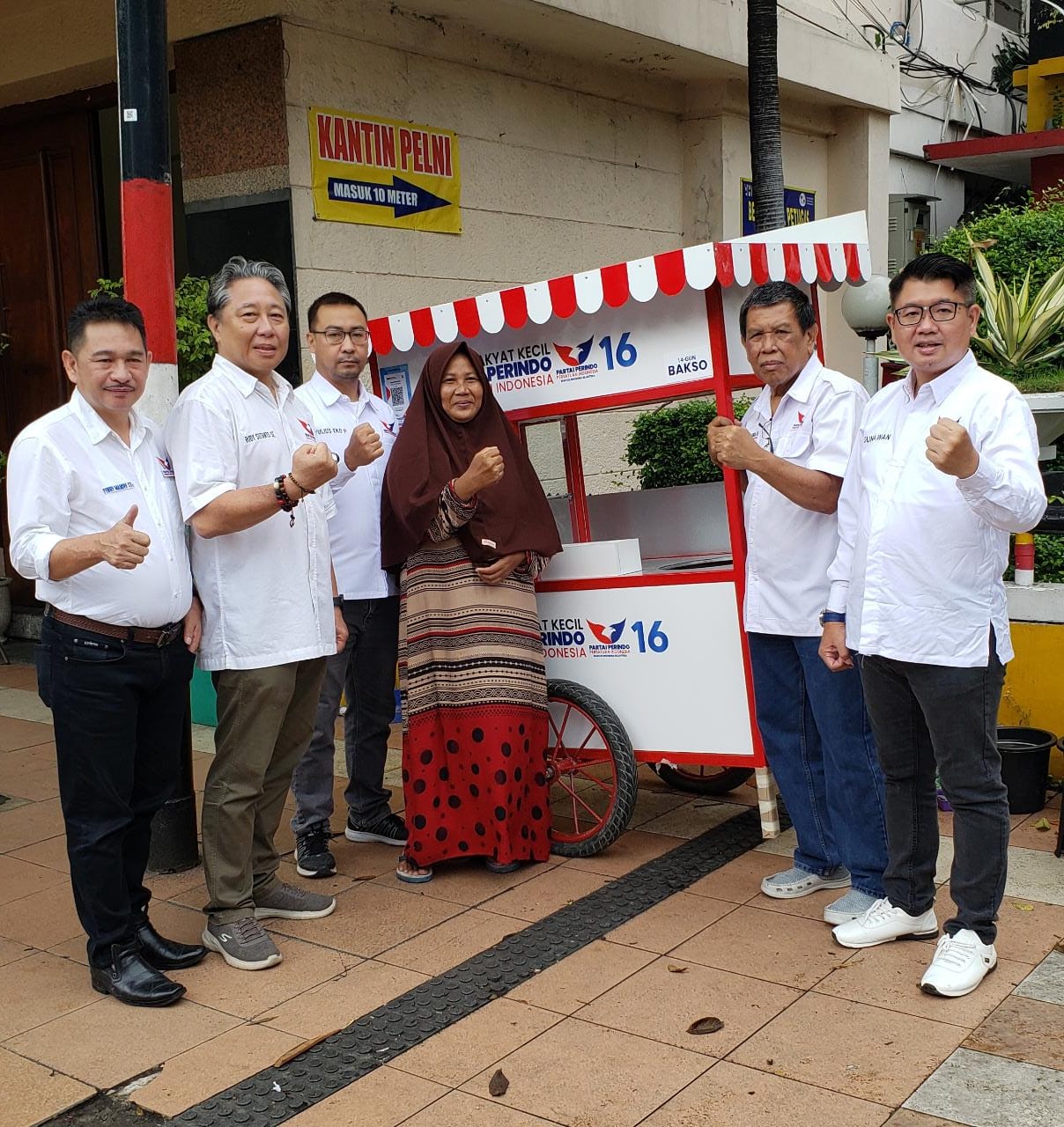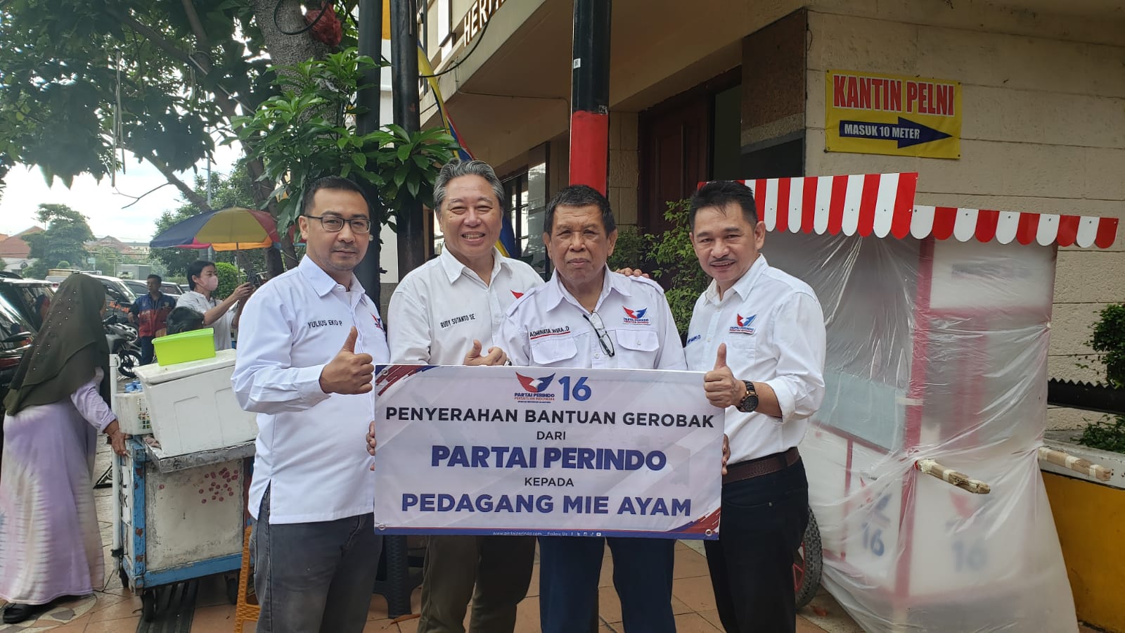 FOTO : 4 Bacaleg dari Partai PERINDO Surabaya menyerahkan bantuan berupa Gerobak Mie Ayam untuk pengusaha UMKM .