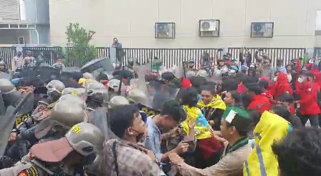 Hingga pukul 14.30 WITA, aksi dorong mendorong kerap terjadi di Gedung DPRD oleh pihak aparat dan dan ratusan mahasiswa. (Putri)