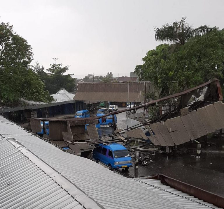 Hujan Deras Si Sertai Angin Kencang Membuat Atap Parkir di Arjosari Ambruk