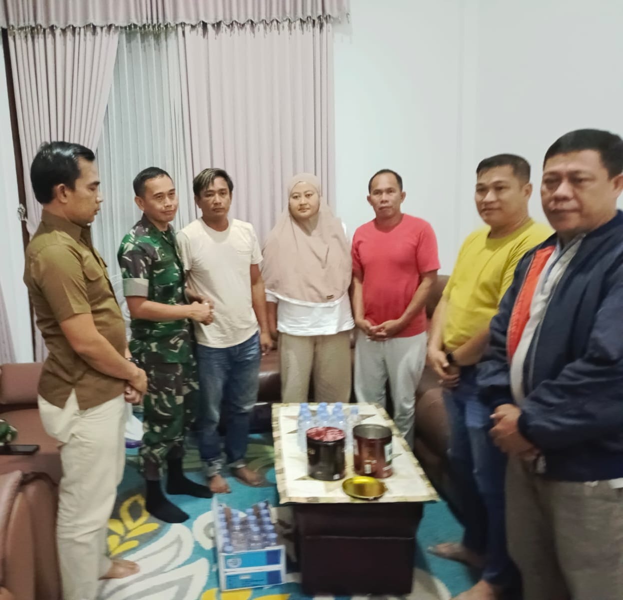 DAMAI: Dari kanan Srk DS, Rahman, (sopir truk cpo), suwandi, dan Istri (keluarga korban).